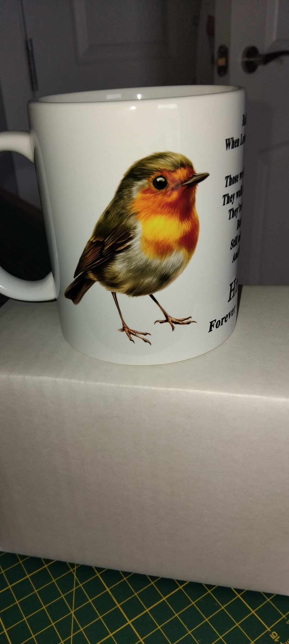 Memorial mug showing a Robin bird and a verse for in memory of your husband.
